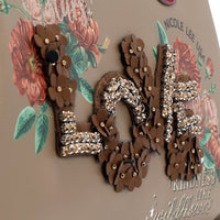 - Esta colección tiene la palabra LOVE hecha de flores y pedrería que se colocan encima de un estampado floral.