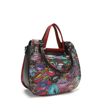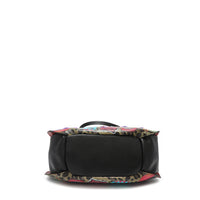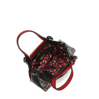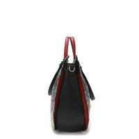 - El diseño frontal está adornado con lentejuelas y pedrería iridiscentes y herrajes metálicos con el logotipo
