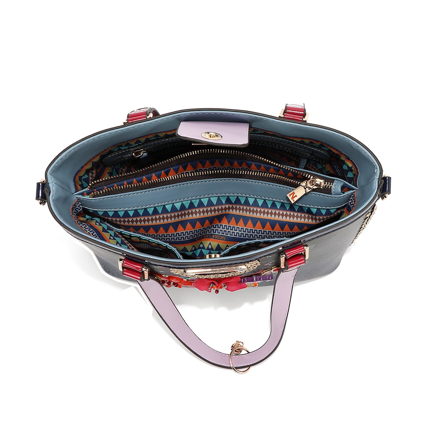 - Placa de identificación con logotipo grabado con diamantes de imitación y tiradores de cremallera.